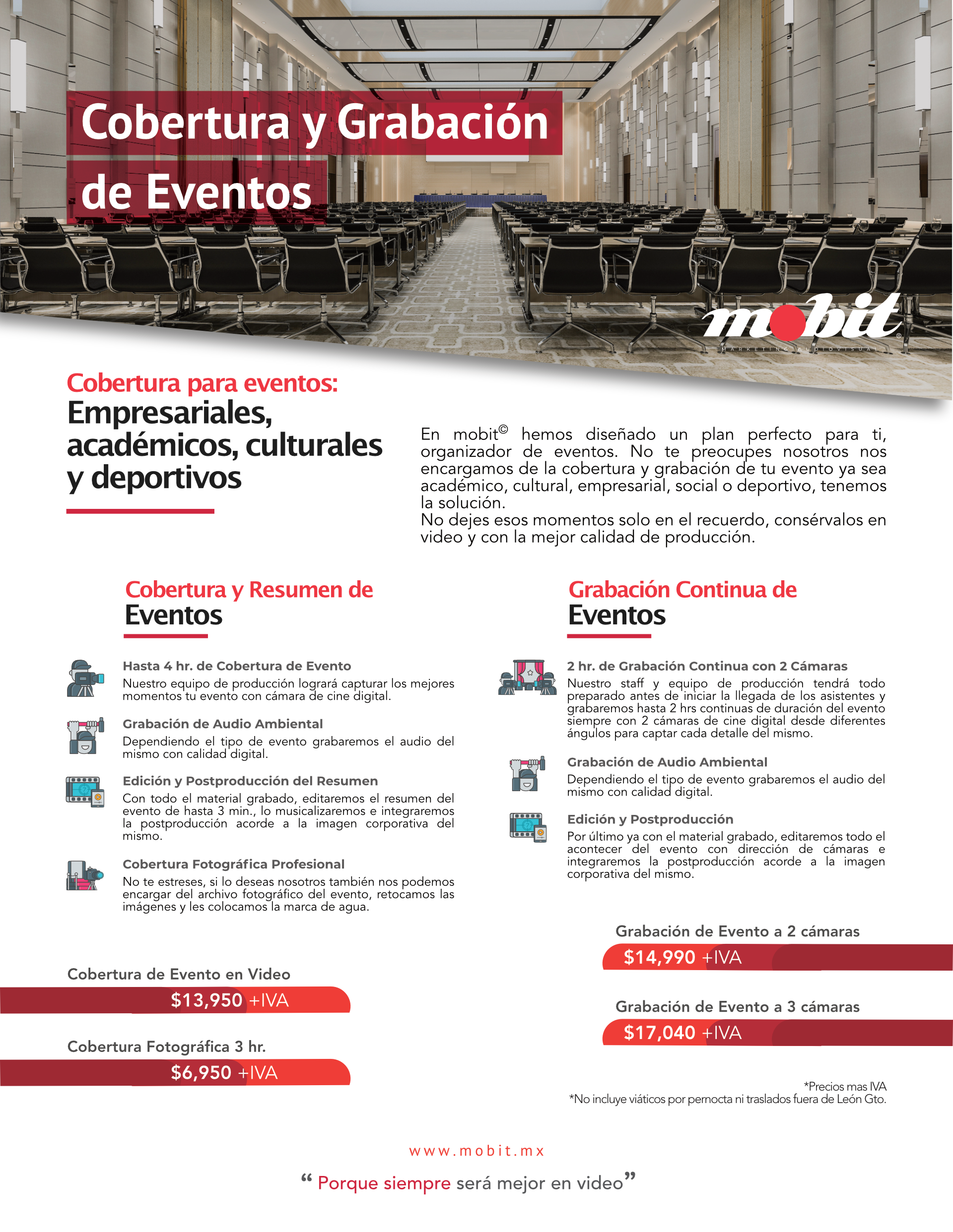 En mobit© hemos diseñado un plan perfecto para ti, organizador de eventos. No te preocupes nosotros nos encargamos de la cobertura y grabación de tu evento ya sea académico, cultural, empresarial, social o deportivo, tenemos la solución. No dejes esos momentos solo en el recuerdo, consérvalos en video y con la mejor calidad de producción.