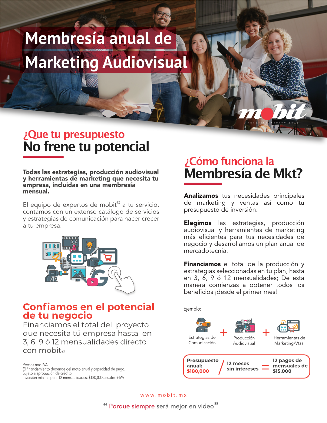 Todas las estrategias, producción audiovisual y herramientas de marketing que necesita tu empresa, incluidas en una membresía mensual. El equipo de expertos de mobit© a tu servicio, contamos con un extenso catálogo de servicios y estrategias de comunicación para hacer crecer a tu empresa.