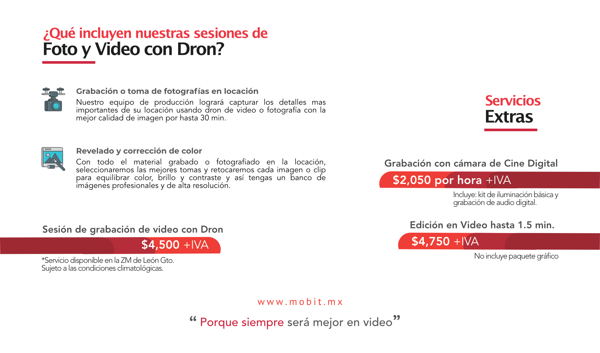 En el mundo digital actual, la calidad visual de tu negocio no es una opción: es tu carta de presentación. En Mobit entendemos que "como te ven, te compran", y por eso hemos desarrollado servicios de captura aérea que transformarán la percepción de tu marca.