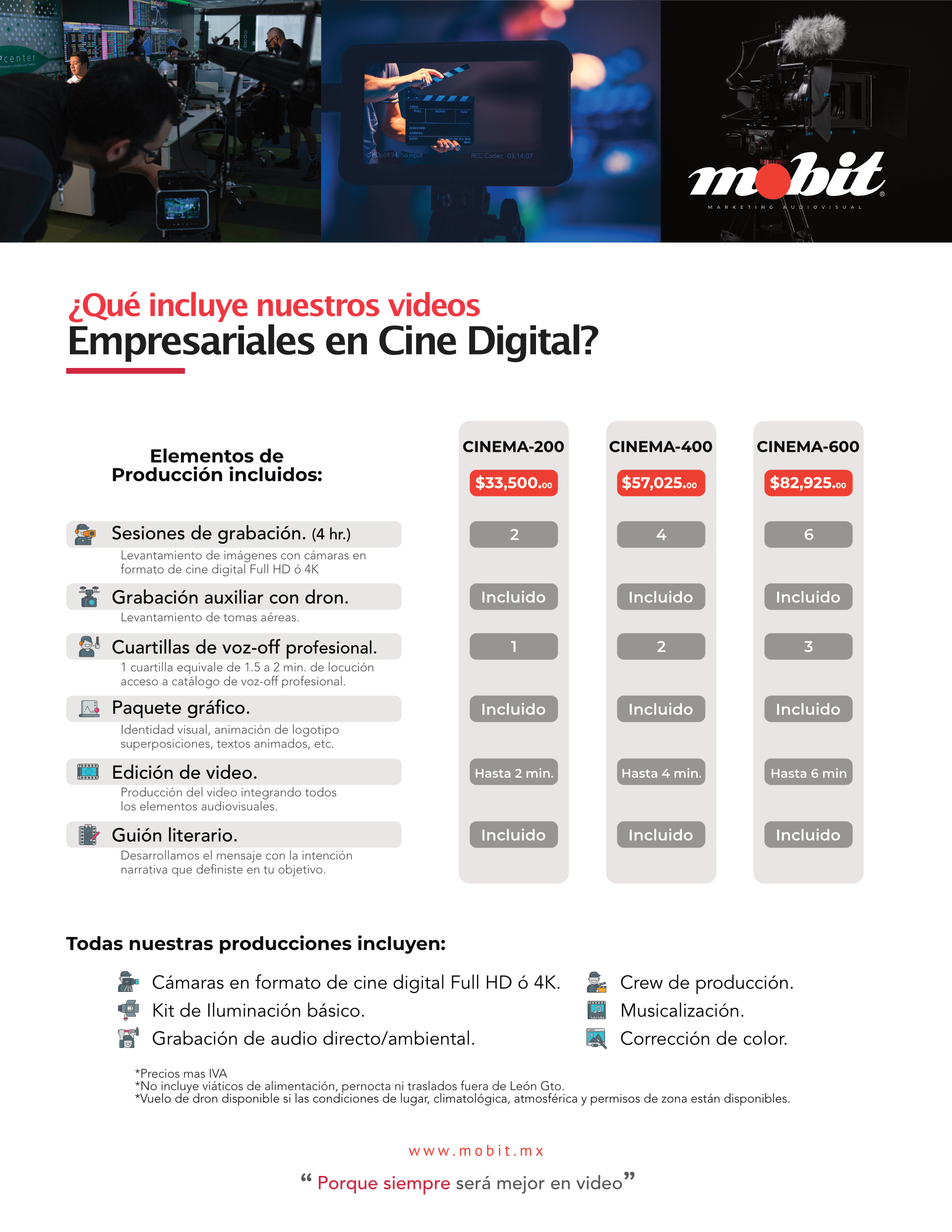 No hay mejor manera de cautivar a tus clientes que con videos corporativos, los mensajes y la calidad de producción son lo mas importante ya que proyectas lo mejor de tu marca en ellos y lo das a conocer al mundo, es por esto que en mobit tenemos para ti 7 paquetes de producción audiovisual profesional con tecnología de vanguardia y altos estándares cinematográficos que harán de tus videos la mejor forma de comunicar tu marca y los beneficios de tus productos y servicios.